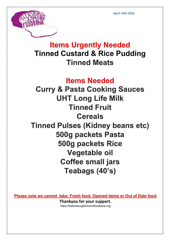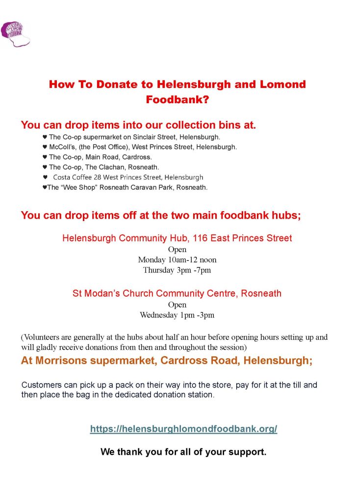 Helensburgh & Lomond Foodbank is an independent Foodbank run entirely by volunteers located both in the Helensburgh Community Hub Monday 10-12 & Thursday 3-7pm and at St Modan’s Church Community Centre, Rosneath, G84 ORD. Every Wednesday; 1-3pm